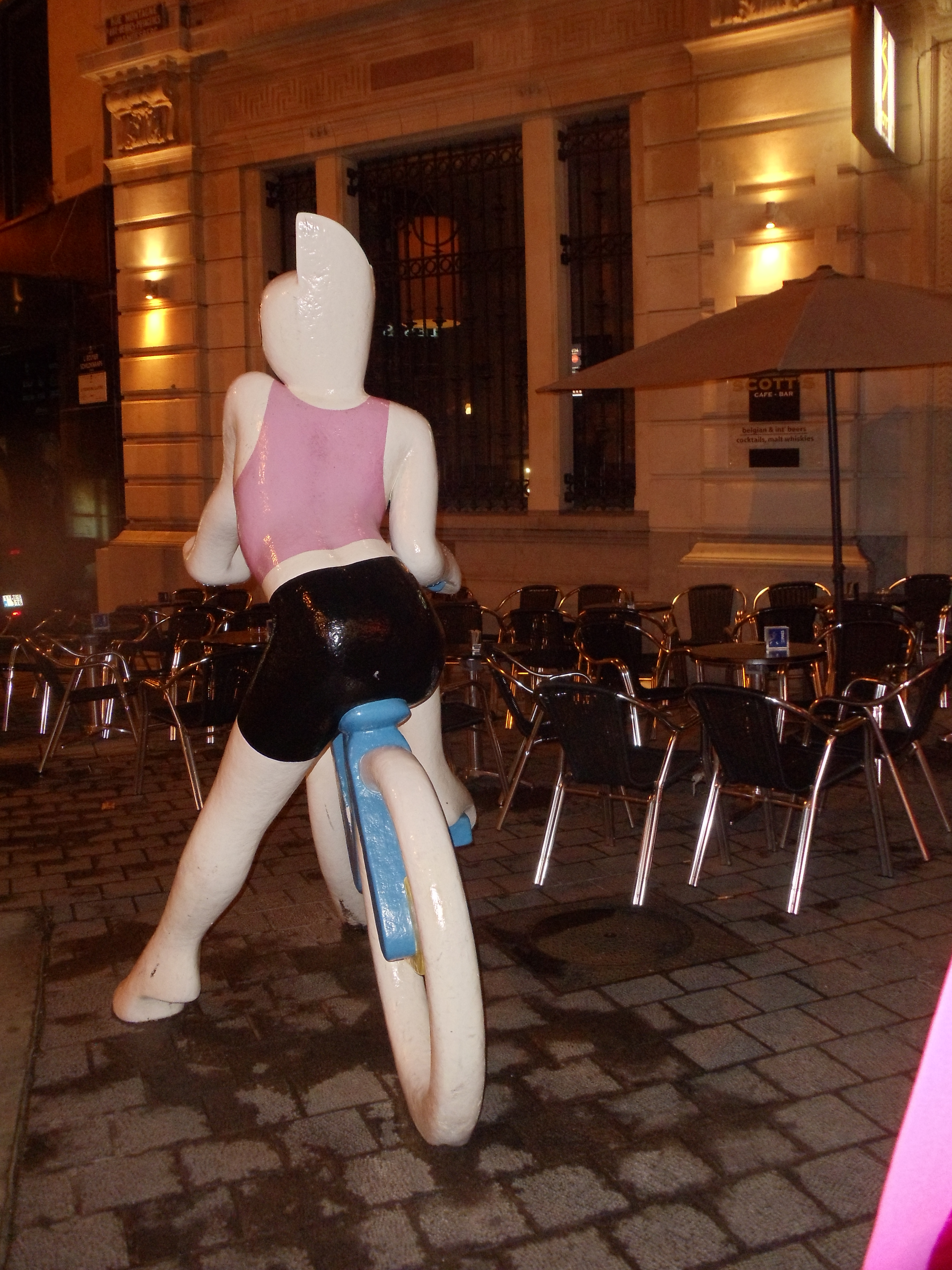 At the hotel, we grabbed Arturo with us and told him we wanted to locate a club. Lest I say it, total disaster. We really should have found it before we left the hotel. We ended up going everywhere but. I took pictures by the second statue I posted here, snapped pics of Arturo by a cathedral and him clutching the ass of a strangely seductive cat statue riding a bicycle (look below). We attempted the bar nearby where the cat is situated and it was way too boring. Ended up going to where everybody else was for the past three days–Delirium. Michelle and I called it an early night because we were not excited to stay at a bar when all we wanted to do was dance!
