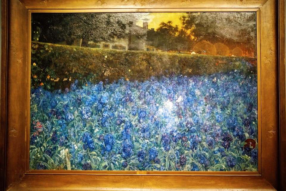 It seems as if Van Looy has lavishly strewn blue flowers all over this large canvas. Looking a bit longer, however, one notices the artist’s house in Soest and the hay wagons behind the tall hedge, and in the right foreground an overturned pot among the flowers. The painter was clearly inspired by the landscapes of Van Gogh, but his representation of nature and the fall of light are more realistic.