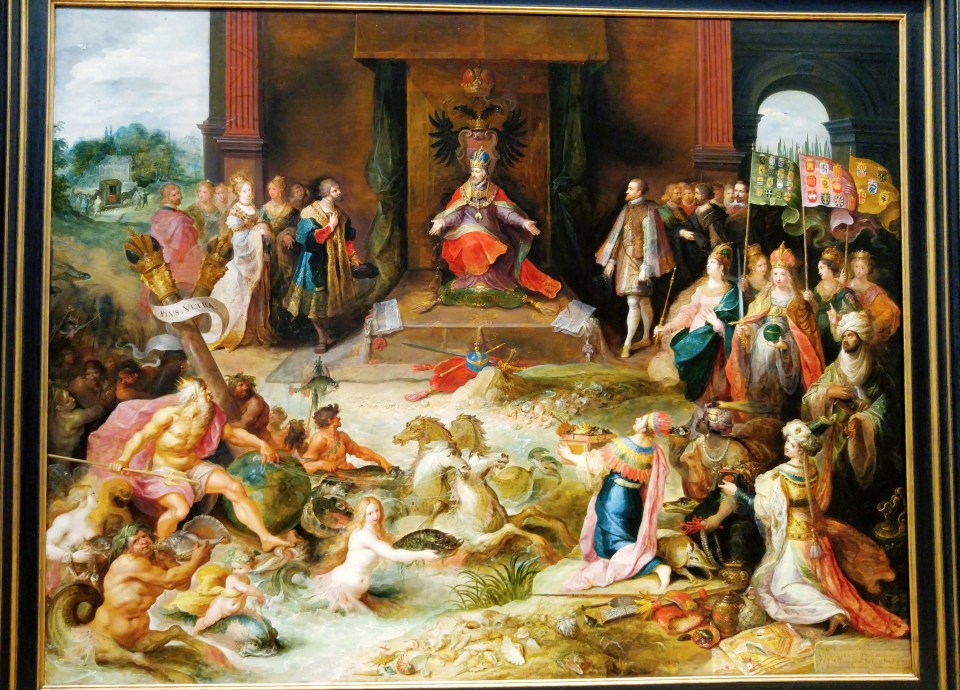Charles V is enthroned at center. Battle-weary and wracked by illness, in 1555 he divided up his empire. He gave his brother Ferdinand (left of the throne) the Holy Roman Empire, while his son Phillip (at the right) became King of Spain and Lord of the Netherlands. The four figures in the right foreground personify the continents over which Charles’ vast empire stretched. Neptune (left) symbolizes his power at sea.